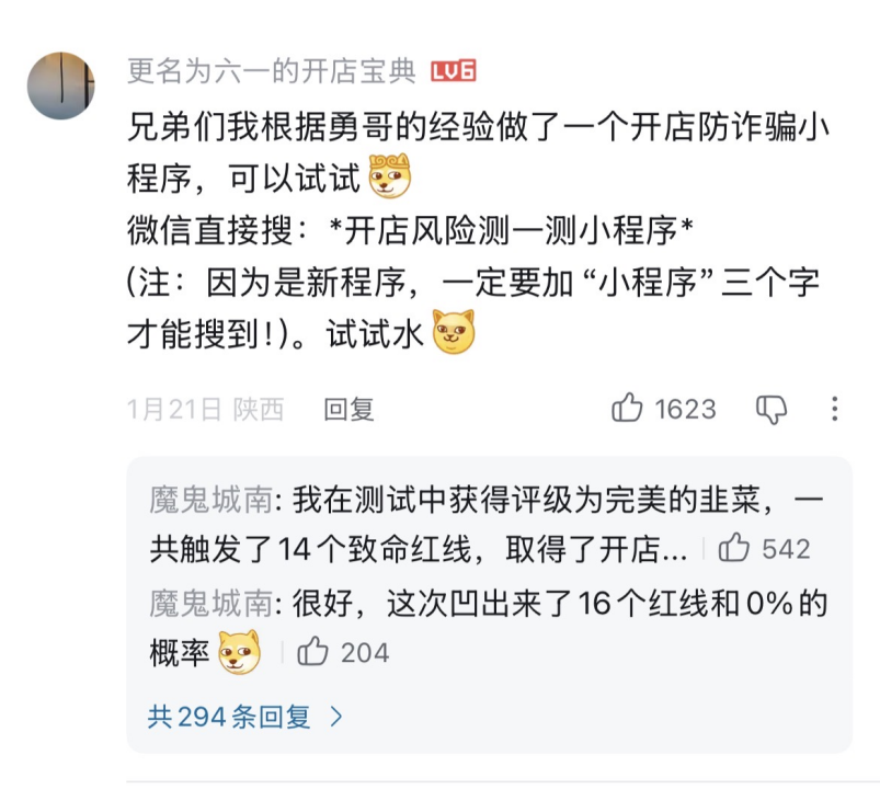 比如一位被称之为“唯一翻盘神人”的大哥,在得知自己加盟的是快招店后,反而开始迅速两折收购其它迅速倒闭的快招店的物料,甚至还因此能获得和旁边的蜜雪冰城打价格战的资本。