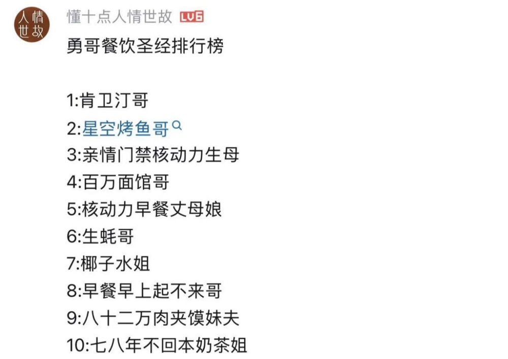 然而,以“家是本”的抽象程度,在网友总结出的“勇哥餐饮神人榜”中,甚至还挤不进前三名。