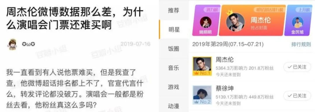 市场当然会给反复自我调用的周杰伦一个教训。这个教训就是,到了2019年有人在豆瓣提问:周杰伦微博数据差,为什么演唱会门票还难买?这场当时闹得轰轰烈烈的打榜PK事件,如今看来并不完全是粉圈之争,其中也藏着更深的暗流——老歌迷为他的旧东西买单,但新生代们就是不care他。就算不是蔡徐坤,他们也可以喜欢别人,至少别人的产品是新的。大众早已识破了他的自我重复。