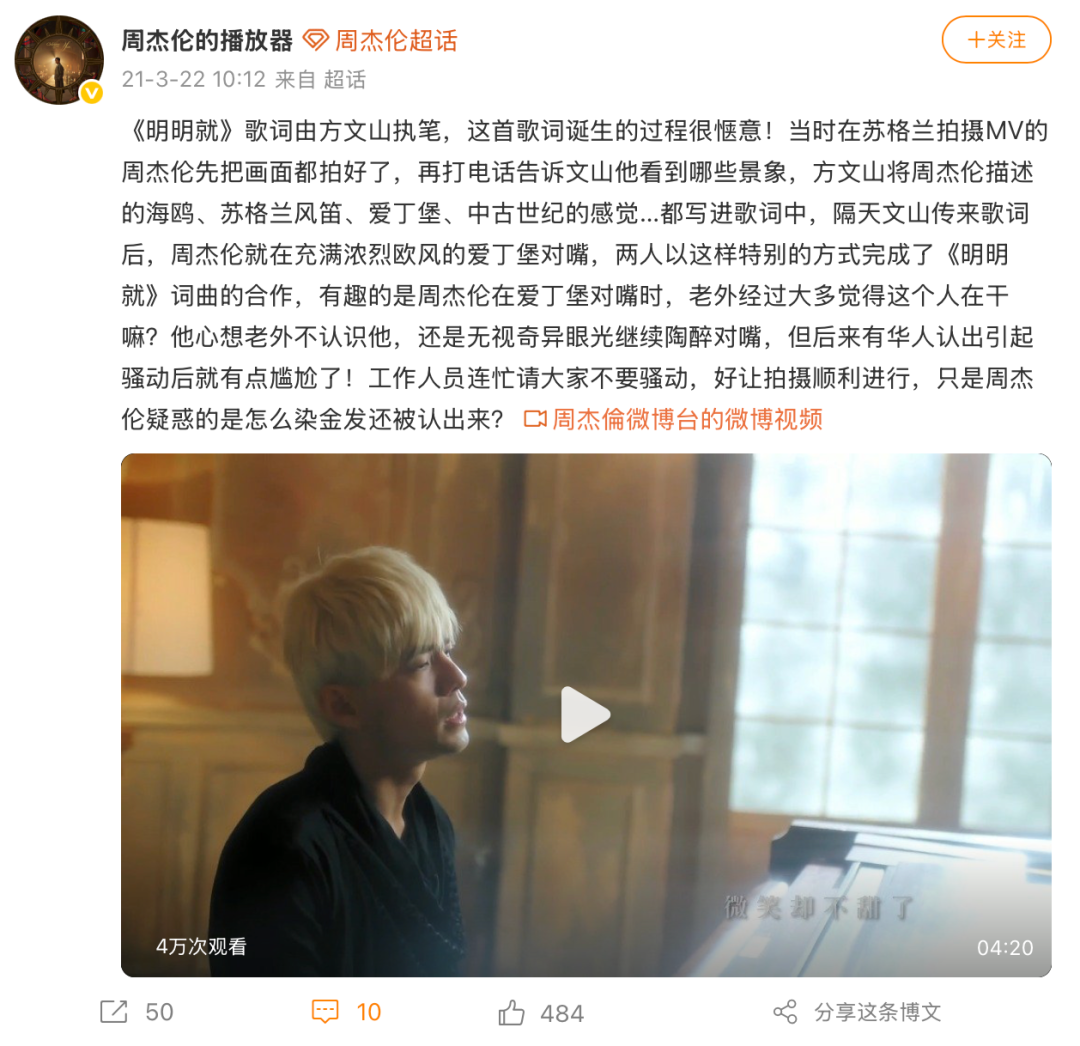 《明明就》公开物料里提到的就是:周杰伦先在爱丁堡拍了带有“海鸥、苏格兰风笛、城堡、中古世纪感”的画面,再让方文山把这些意象写进歌词。这个动作很说明问题:以前他们更像词曲互撞、制作互撞;后面越来越像周杰伦先有一个产品概念,再让搭档来配合执行。他从碰撞的中心点,变成了自己的产品经理,周杰伦是周杰伦最大的产品。