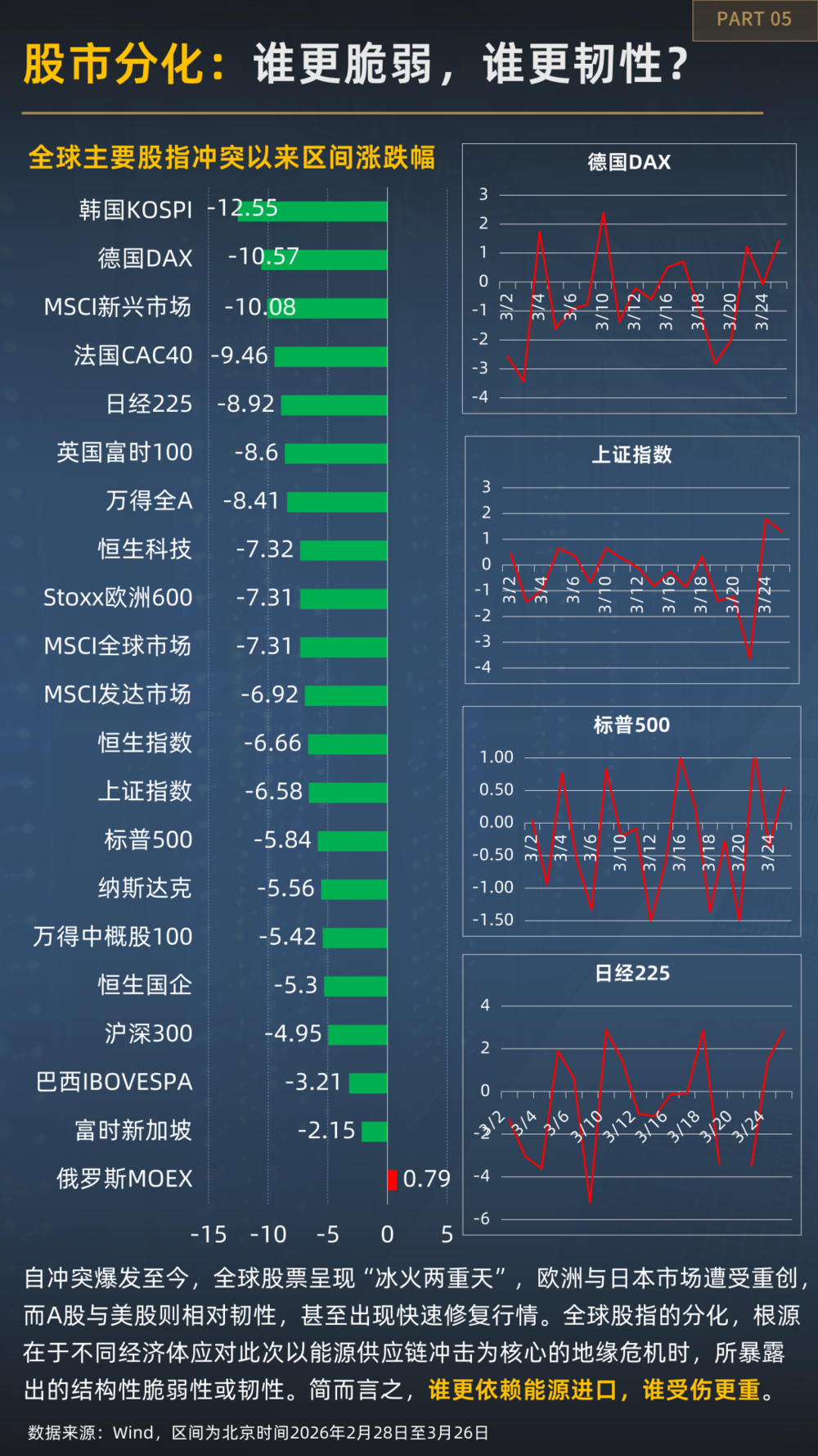 这种分化的本质在于各经济体对能源进口的依赖程度不同。能源依赖度越高、受供给冲击越大的经济体,其股市承压越明显。相反,具备内需支撑或能源结构相对稳定的市场,则具备更强抗冲击能力。
