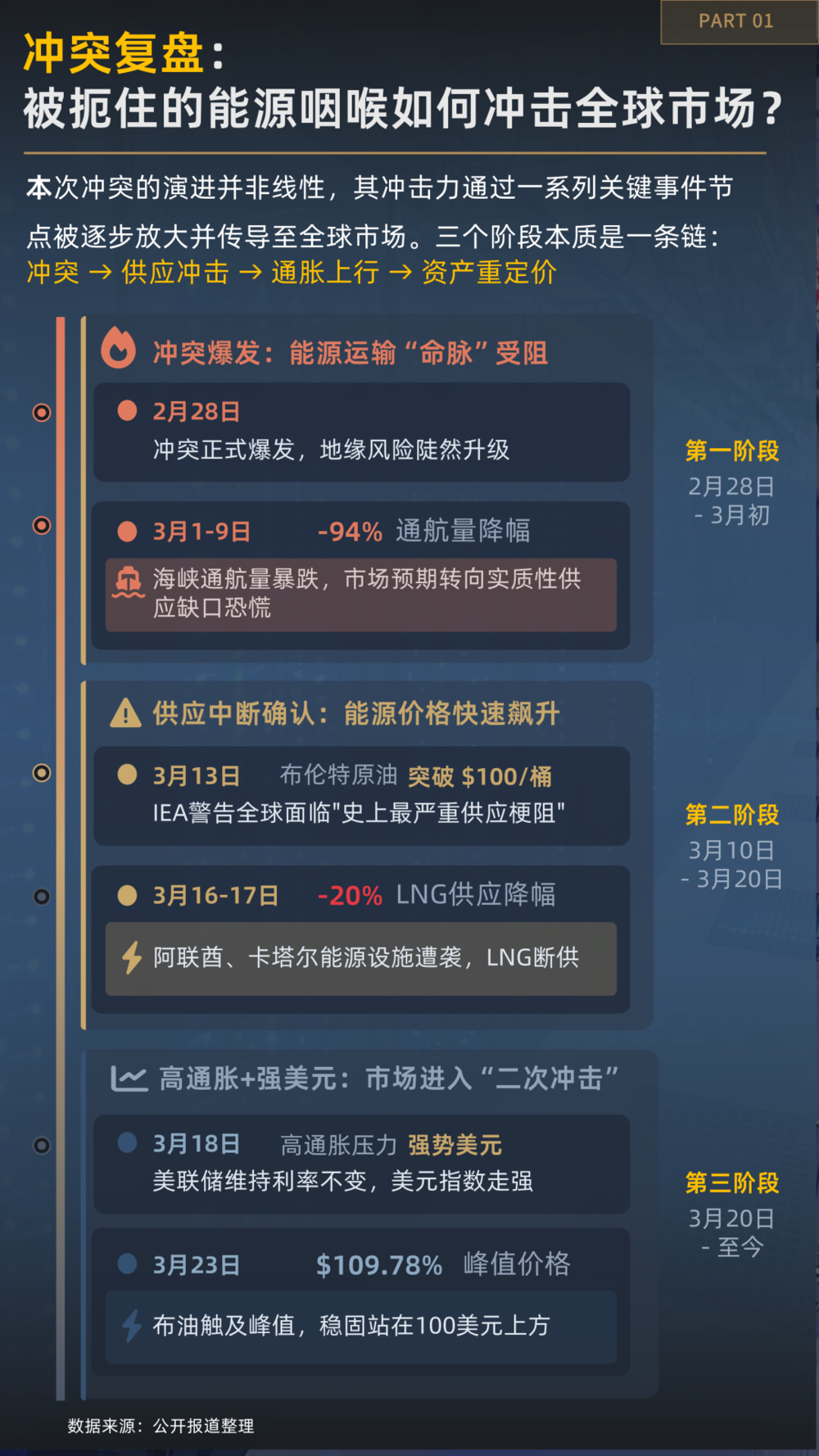 本轮冲突的演进并非单点冲击,而是沿着“冲突—供应冲击—通胀上行—资产重定价”的链条逐步放大。