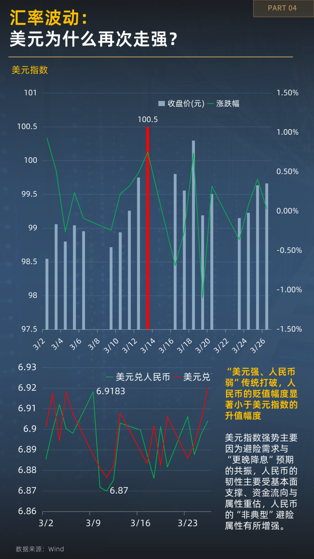 一方面,美元走强源于避险需求与“更晚降息”预期的共振;另一方面,人民币表现出较强韧性,贬值幅度明显小于美元升值幅度。