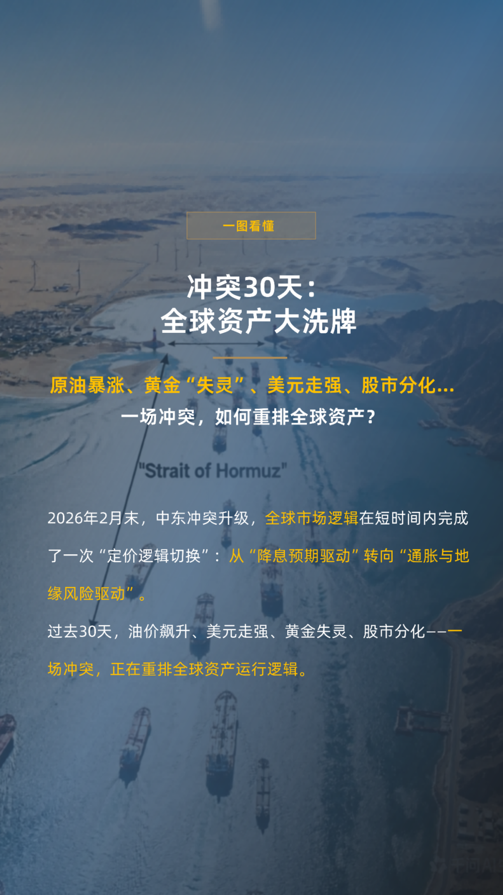 2026年2月末以来,中东地缘冲突持续升级,近30天内,全球大类资产经历了一轮价格重估。从原油价格飙升,到黄金避险失效,再到美元走强、全球股市分化......本轮市场波动已明显脱离冲突前“降息预期驱动”的框架,转向“通胀+地缘风险”的新主线。本期一图看懂基于公开数据梳理,还原这一轮全球资产重定价的核心逻辑。