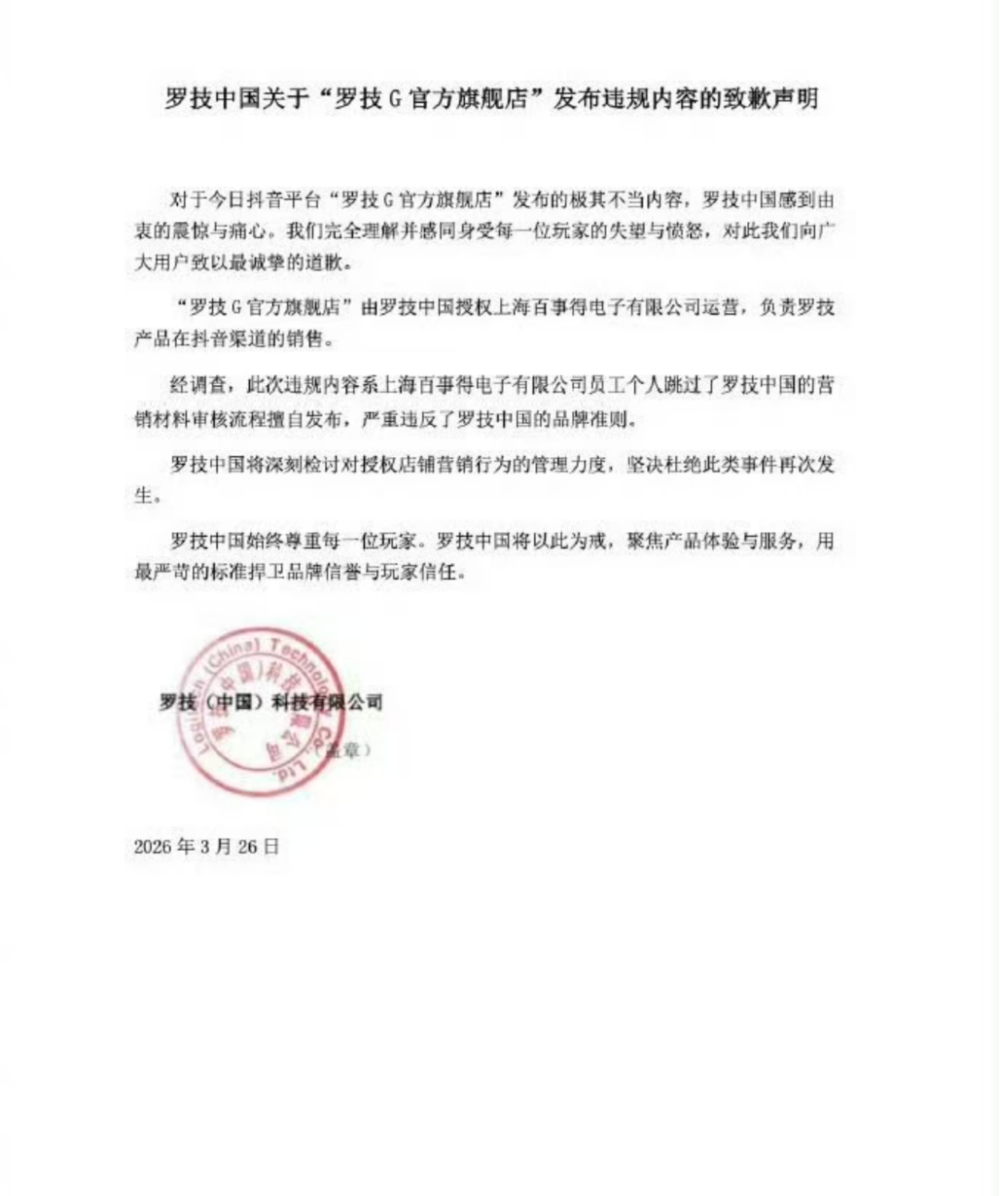 事发后,罗技品牌方与代运营仓促致歉,但这份回应并未获得大众认可被质疑为“甩锅”。
