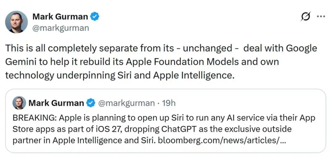 这种转变,将把苹果重新置于分发链条的核心,并打开新的商业化路径。AI的商业化变现,并非只是模型性能的竞争,在很大程度上,真正决定胜负的,是谁能把AI能力分配到哪里、给谁用、以什么方式用。长期跟踪苹果的Mark Gurman认为,其变现方式仍将延续App Store的抽成模式。