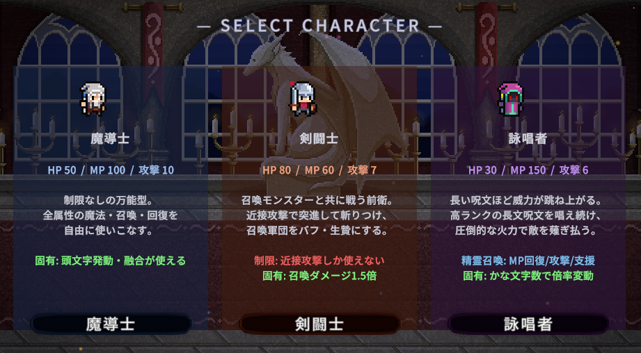 这个名为《打字魔术师》的游戏,作者给出的分类标签为“类Rogue”“打字”和“塔防”,玩家同样需要通过输入日语罗马音来发动攻击或者使用回复道具。我自己试了试,游戏不仅提供了三个职业选择,每个职业还配备了丰富的可选技能和装备。