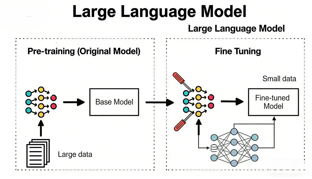 • 精调(Fine-tuning)是在已有模型基础上,用少量专业数据做进一步训练。成本低得多,几百到几千条数据就可以看到效果。