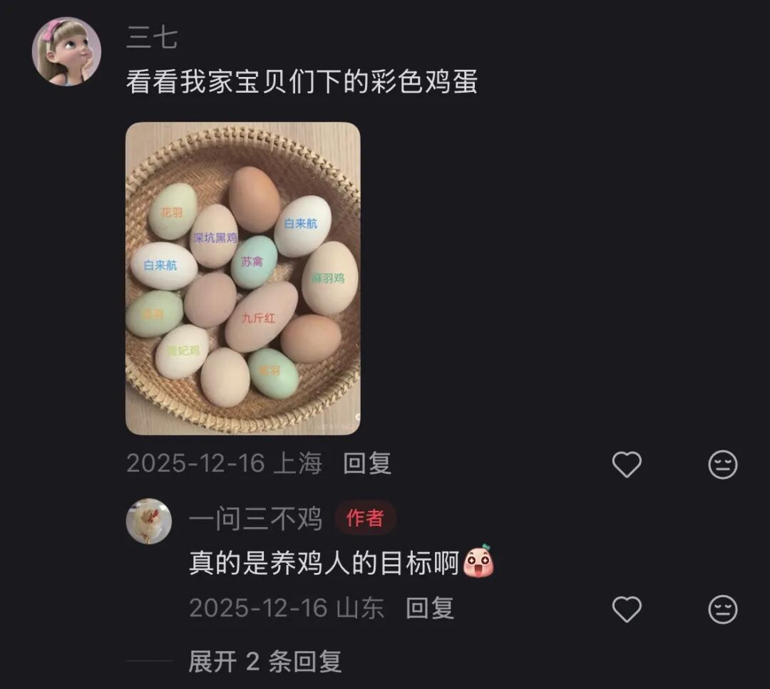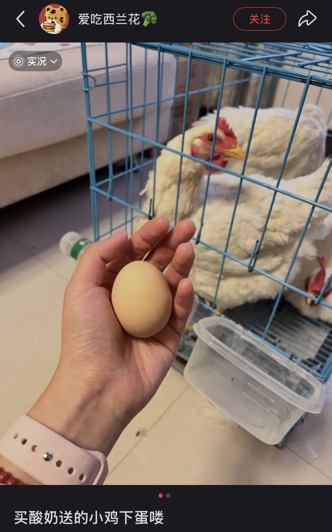 评论区里,养鸡人晒出自家鸡的的各种生活瞬间:在光滑的地板上打滑的窘态、和家里原住猫猫的对峙。当然,还有他们从鸡身上获取的重要资源——鸡蛋。