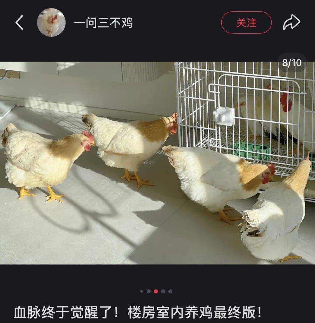 小红书相关话题#宠物鸡#城市养鸡人#养鸡日记分别有3.0亿、2.9亿、4.0亿浏览,这些话题下的笔记,大多都是养鸡人在分享他们的宠物鸡美照。