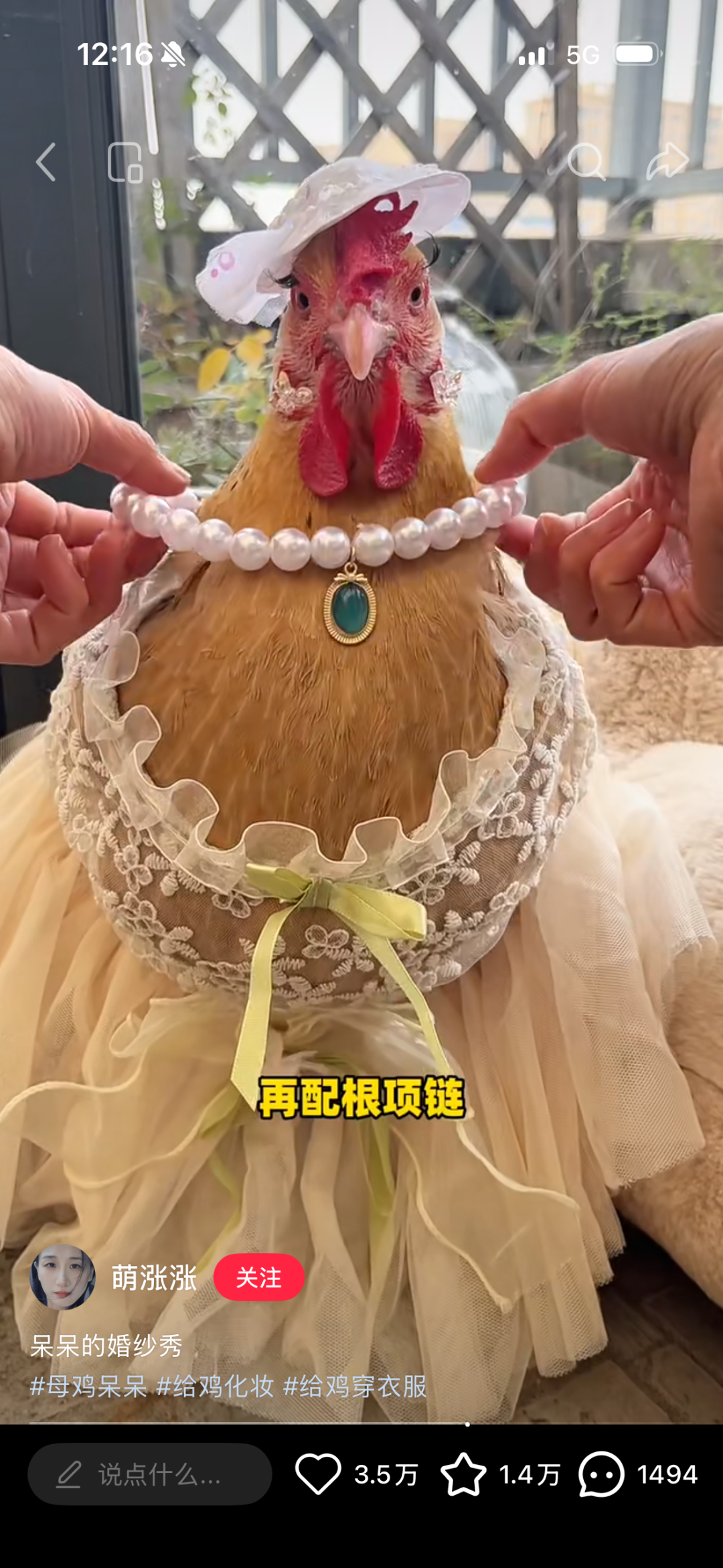 比如十分奢华的婚纱配礼帽,外搭一条珍珠项链。这让鸡看起来贵气逼人。