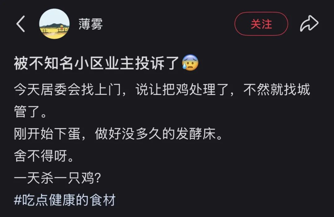 城市里养鸡,麻烦多多,困难重重,还要时刻准备着应对物业和城管的敲门。