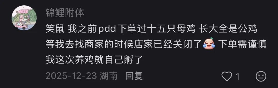 当然,如果有选择,谁不想养一只安静下蛋的小母鸡呢。但事实上,小鸡在雏鸡阶段很难通过肉眼分辨公母。很多养鸡人的掉进的第一个坑,就是在网购平台上买到的“100%母鸡苗”。