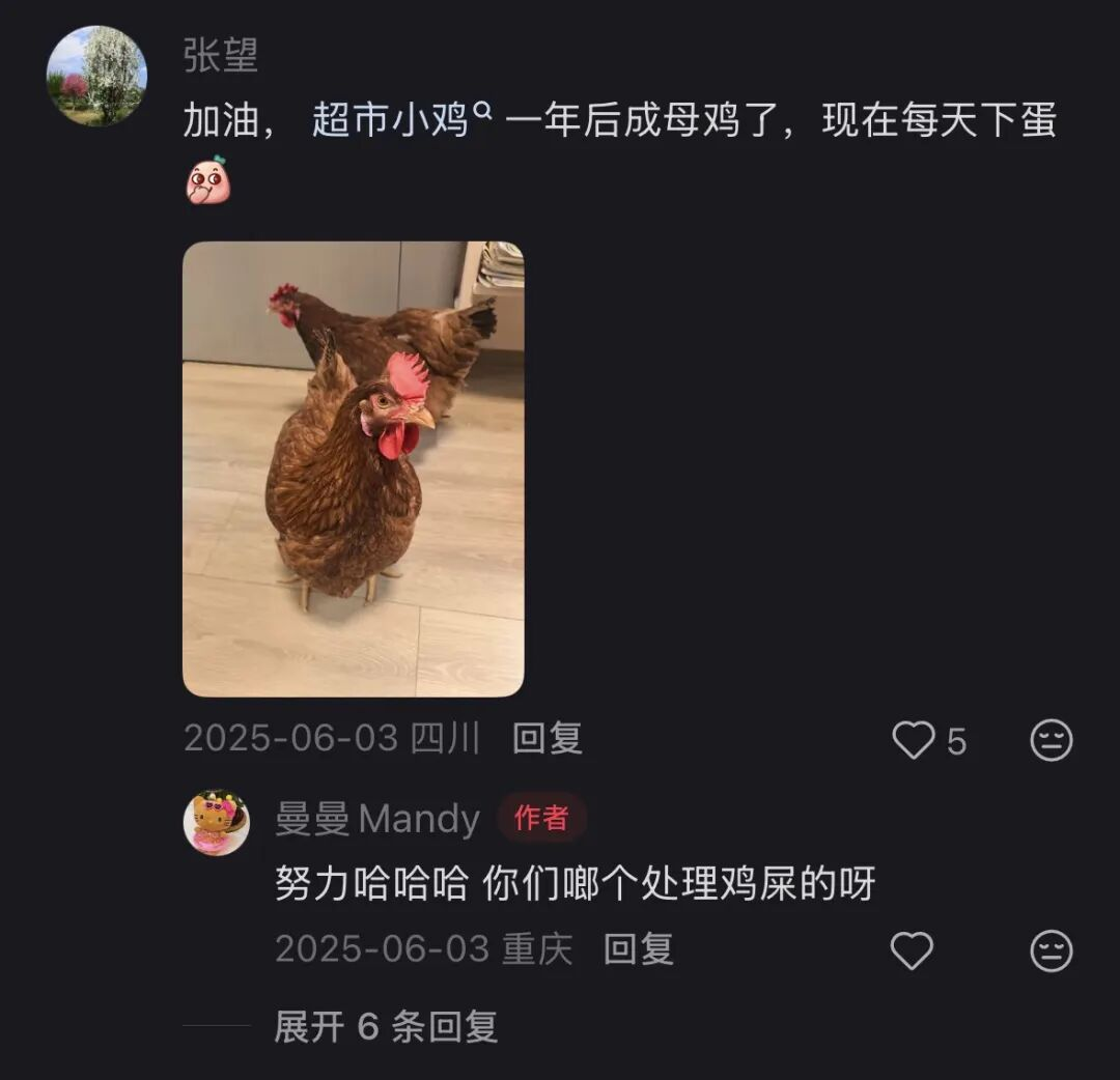 养鸡当宠物,就像建立一种低压力、高确定性的关系。低压力,是因为不用时刻回应它的情绪;高确定性,是因为只要给了它基本的生存条件,它就会用一颗暖烘烘的蛋来回报你。