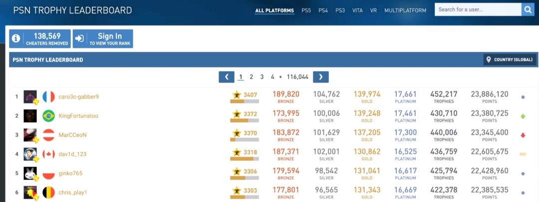 PSN Profiles网站上的奖杯数量榜