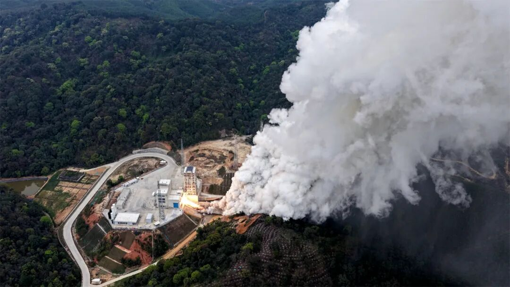 图:试车中的星际荣耀焦点二号发动机。发动机型号从研制到首飞,一般要经历累计长达数万秒的试车。