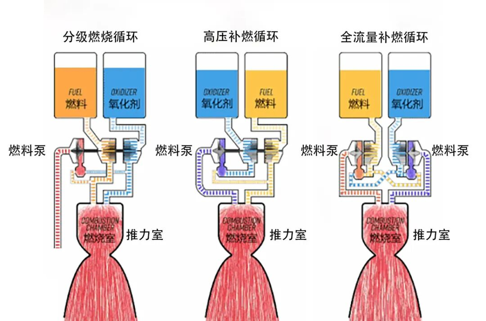 高压补燃循环:将泵的排气接入推力室再次燃烧。其燃料利用更加充分,研制难度也有所提高。