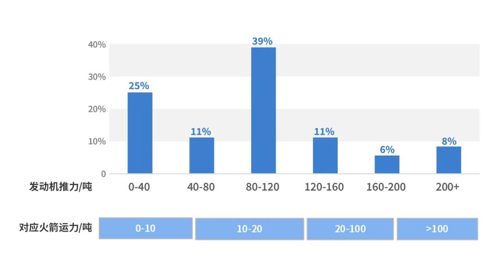 我国商用航天发动机虽然型号众多,但参数指标并未平均分布,而是存在一定“扎堆”现象。以最重要的推力为例,3/4的发动机聚集在0-120吨之间,对应火箭入轨运力在20吨以内。