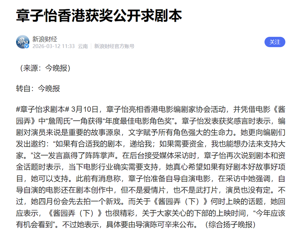 甚至连章子怡这样的头部女演员,都表示无戏可拍,公开求剧本。