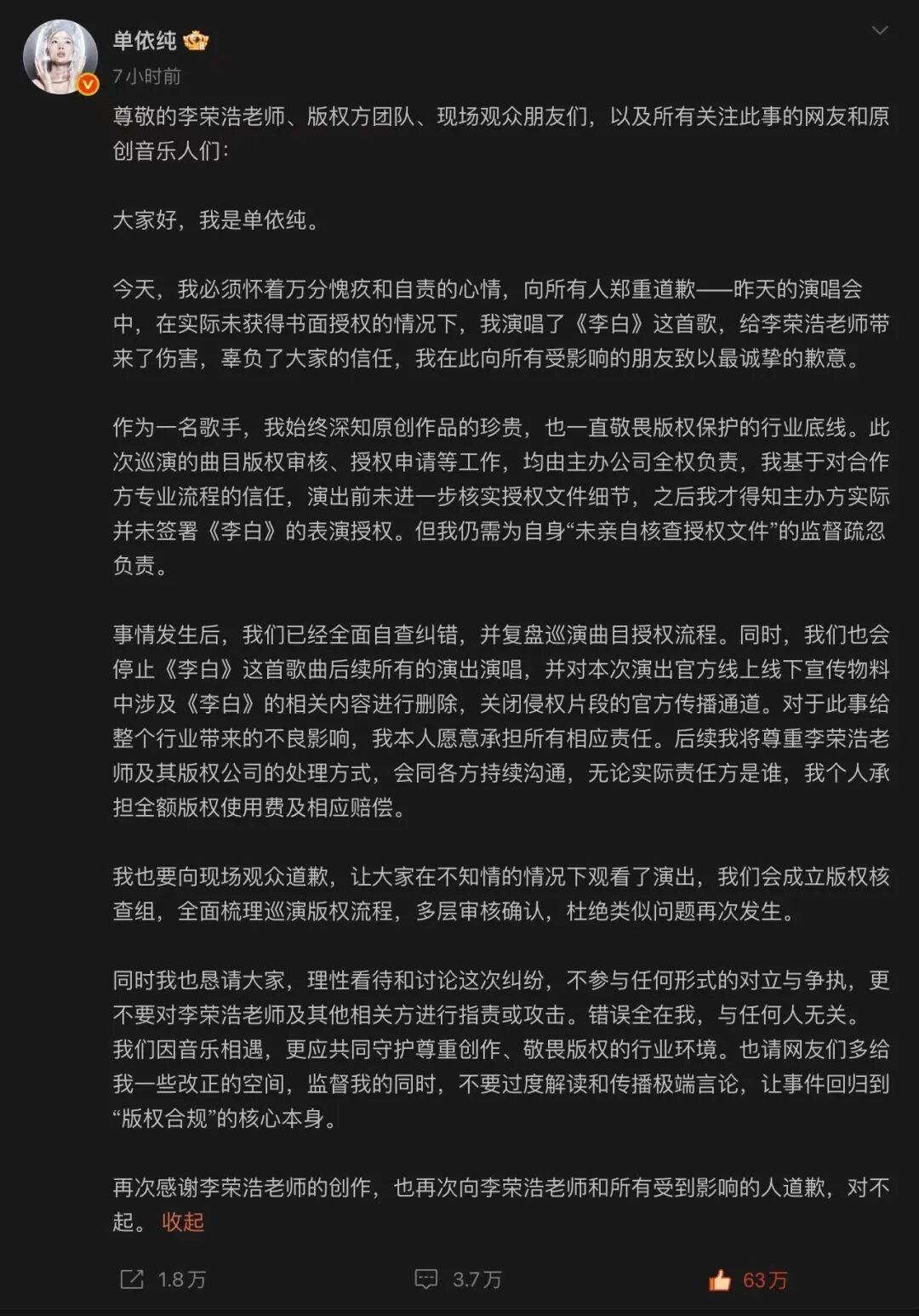 单依纯公开致歉,明确承认问题,说明巡演曲目版权审核与授权申请均由主办公司全权负责,并给出整改路径——自查纠错、停止演唱、删除内容、复盘流程、成立版权核查组、多层审核确认。态度清晰,动作具体。