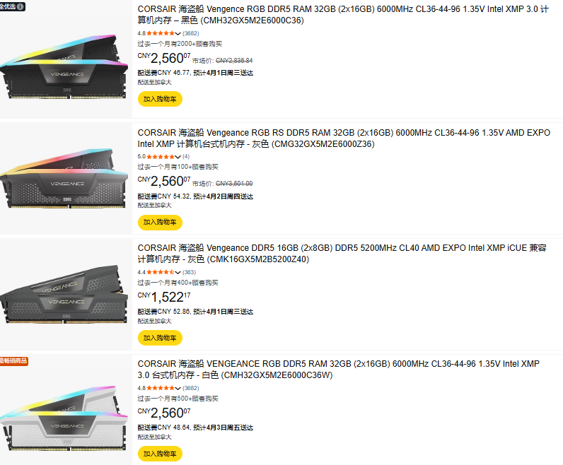 其中海盗船的复仇者(VENGEANCE)系列DDR5内存降价最为抢眼。以32GB容量、最高6400MHz频率的型号为例,其售价目前约为379.99美元,较近期峰值的490美元大幅下降。16GB容量、5200MHz频率的型号产品,目前售价为219.99美元,相比之前的历史最高价260美元下跌了18.2%。