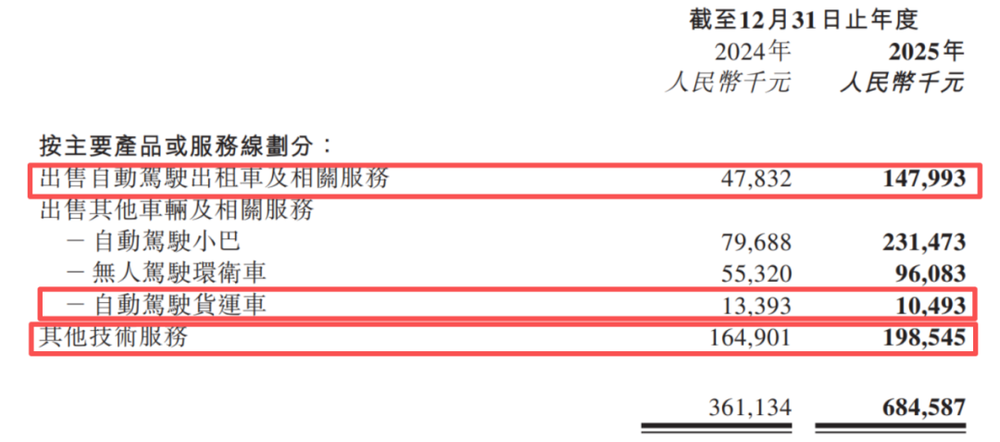 相比之下,2025年全年,小马智行主要以“Robotaxi+Robotruck”双轮驱动为核心,同时面向车企提供技术方案。期内,小马智行Robotaxi业务收入达1.16亿元,同比增长129%;Robotruck业务收入2.84亿元,较上一年仅微弱增长0.6%;技术授权创收2.29亿元,较上年同期增长19.71%。