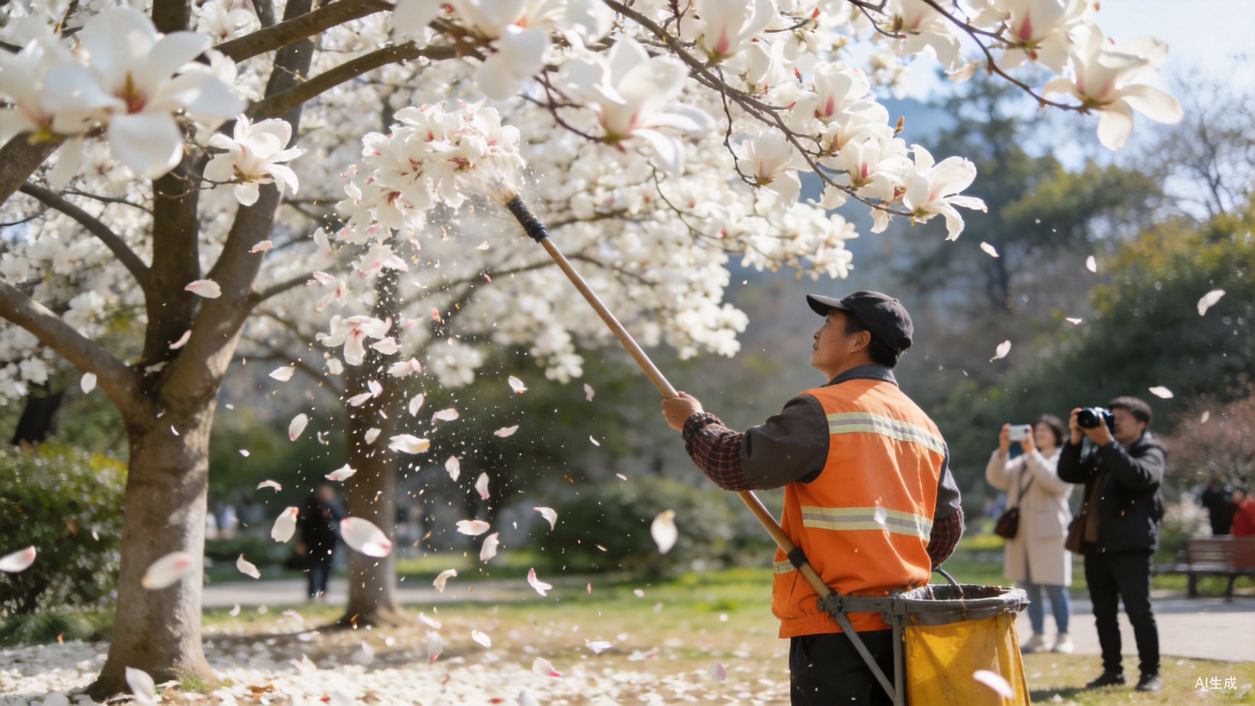 一座公园内,玉兰花正在盛放,一位头发斑白的身着工作服的清洁工挥动长杆,奋力将花朵一簇簇击落。路过的游客一边拿手机记录,一边劝阻:“这么好看的花,要给它打下去,还没看呢,哪儿有这么干的啊?现在正是观赏的时候。”劝阻无效,老清洁工继续打花,镜头一摇,不远处其他人正对别的玉兰下手。