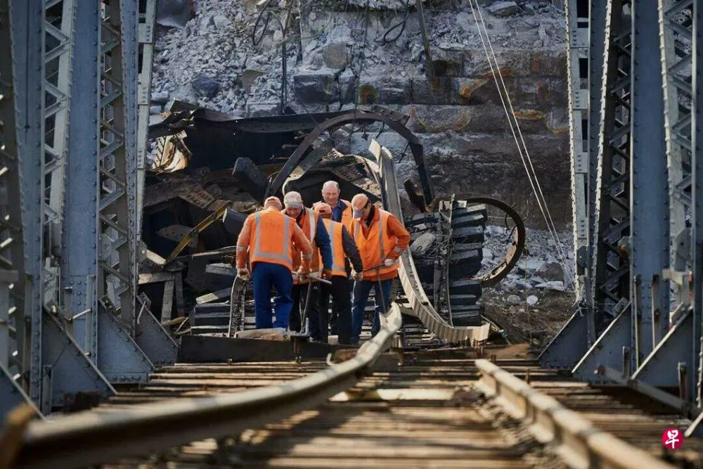 乌克兰铁路公司工人在战争爆发初期,抢修基辅以北伊尔平河上的铁路桥。乌克兰铁路公司提供