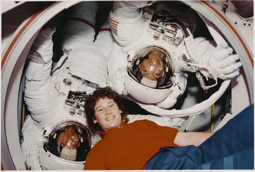 拍摄于1984年STS-41G任务,图为宇航员凯瑟琳・沙利文与即将出舱的队友在挑战者号气闸舱内