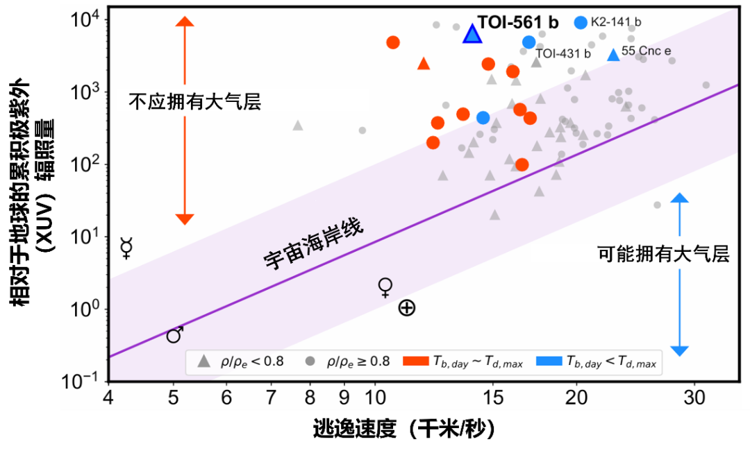 此前,天文学家基于太阳系行星的特征,提出了一条“宇宙海岸线”法则:行星能否保留大气,取决于它的逃逸速度与接收的恒星辐射量这两个核心参数——逃逸速度低(自身引力弱)、接收恒星辐射量高的行星,必然会失去大气。但TOI-561b的逃逸速度与地球相当、承受了远超地球的恒星辐射,却依然拥有厚重大气,这直接挑战了这一法则的普适性。
