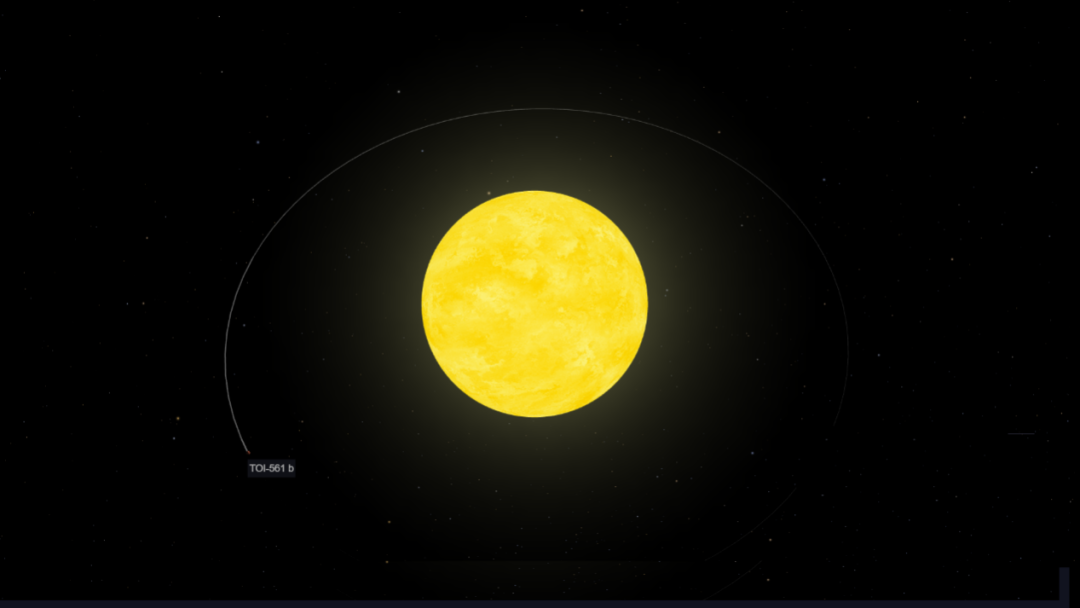 TOI-561b围绕着一颗形成于约100亿年前的宿主恒星(“年龄”差不多是太阳的两倍)运转。这颗宿主恒星属于“厚盘恒星”,铁元素含量低而α元素丰富,与太阳系的化学环境截然不同。TOI-561b和宿主恒星之间的距离仅约159万公里——大约是地球和太阳距离的1%。