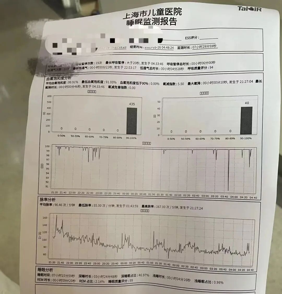 入院后,我们做了夜间多导睡眠监测(PSG)。监测报告显示,儿子在睡眠中已出现明确阻塞性呼吸事件,血氧饱和度有下降。