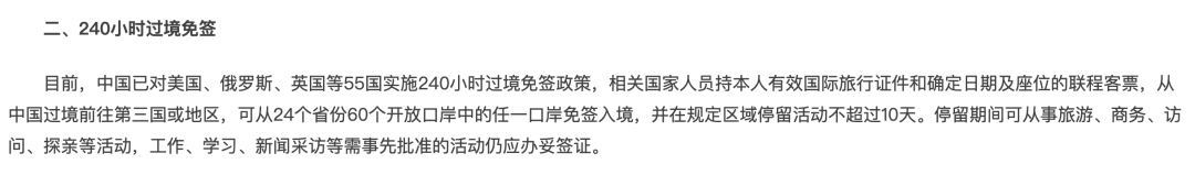 符合条件的俄罗斯、巴西、英国、美国、加拿大等54国人员,从中国过境前往第三国(地区),可从24个省(区、市)60个对外开放口岸中任一口岸免签来华,并在规定区域停留活动不超过240小时。
