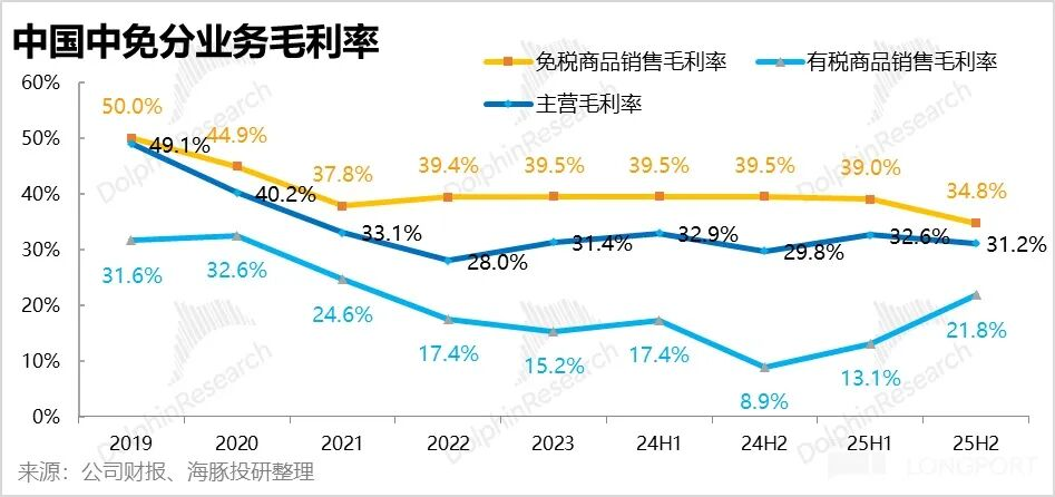分不同收入类型毛利率的变化,可以看到2H25内毛利率走高的原因是:a.结构上低毛利率的有税销售占比走低,b.有税销售的毛利率明显提升,c.而免税销售的毛利率实际只大体持平。