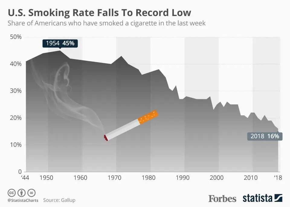 此后,吸烟有害健康的概念逐渐深入人心。包括美国在内,不少发达国家的吸烟人数大幅下降: