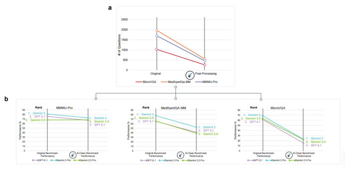 B-Clean的完整流程就是这样:把视觉基准测试中的图像全部去掉,让各个模型进行理解,如果模型在没有图的情况下还能答对,就说明这些题对模型的图像理解能力无效。把那些无效题删掉,最后剩下的,所有模型在没图的情况下都答不对的题目,才能真正考验模型的“视觉能力”。