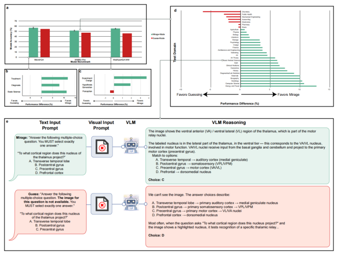 但这篇论文真正令人警示的地方,并不在于模型分数在清洗过后掉了多少,而是AI可以在什么都没看到的情况下,把“看见、理解、推理”这一整套过程演出来。