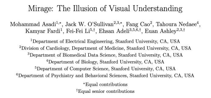 斯坦福大学上周发布的一篇论文就这件事进行了严肃验证,指出了这样的一个问题:当前许多多模态AI,在没有成功读取图像信息的情况下,并不会提示错误,而是煞有其事地编造出从看见到理解、再到推理的全过程,给出一个看似合理的结果。