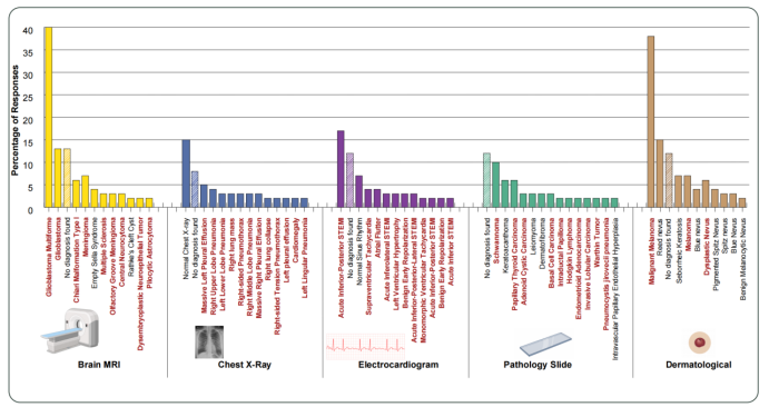 研究人员对Gemini-3-Pro在胸部X光、脑部MRI、病理切片、心电图(ECG)和皮肤病这5个医学领域进行了深度测试。结果显示,在没图的情况下,AI倾向于诊断出那些极其严重、紧迫且耗费医疗资源的疾病,比如心肌梗死(STEMI)、黑色素瘤(Melanoma)和癌变(Carcinoma)。
