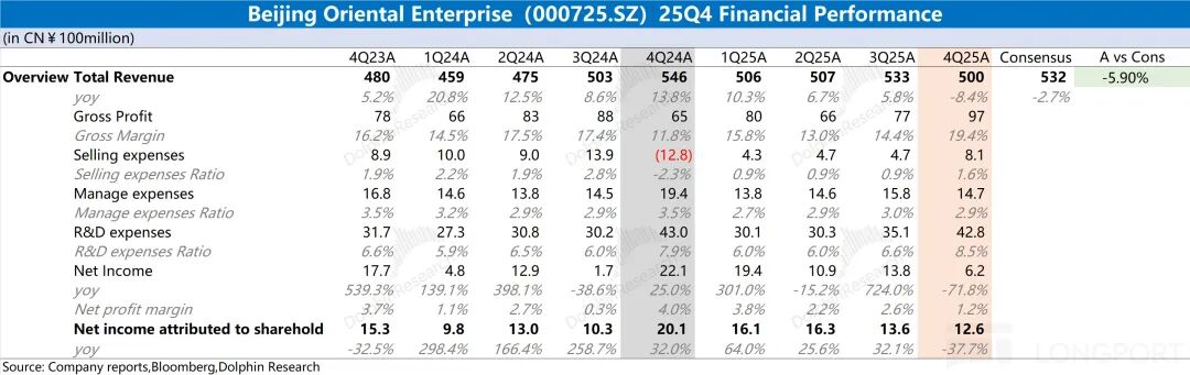 1.整体业绩:京东方2025年第四季度实现营收500亿元,同比下滑8.4%。其中面板市场价格同比略有回落(约1%),公司出货量下滑是主因。