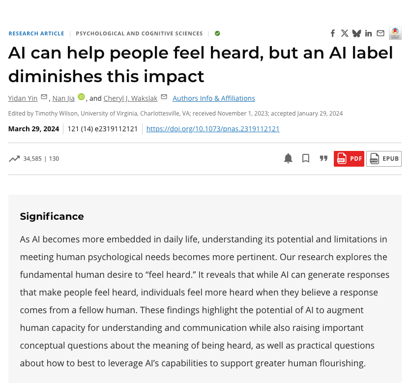 发表在《美国国家科学院院刊》(PNAS)上的一项研究发现,AI生成的安慰消息,竟然比真人写的更让接收者感到“被倾听”。AI在提供情感支持时更稳定、更周全,不会像真人那样因为紧张而说错话,因为尴尬而回避问题,或因为赶时间而敷衍了事。