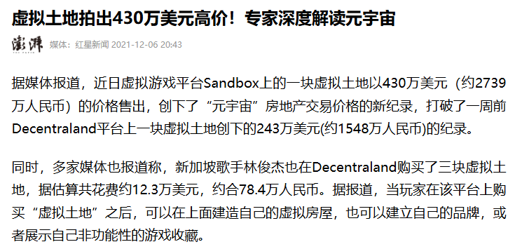 最夸张的时候,游戏《The Sandbox》中的一处地产被卖出了430万美元,约合人民币2738万元,可以在上海买个超大平层了。