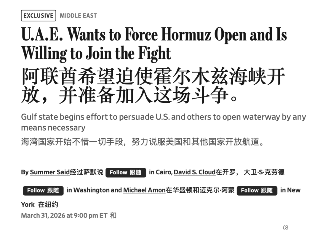 华尔街日报3月31日一篇报道讲,阿联酋已经坐不住了,正在敦促美国和“欧洲和亚洲的军事强国”组成联盟,用武力打通霍尔木兹海峡。说阿联酋正在游说联合国通过一个决议,但即便决议通不过,阿联酋也准备加入战争。