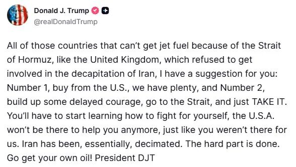 那些因为霍尔木兹海峡局势而拿不到航空燃料的国家,比如拒绝参与“斩首”伊朗行动的英国,我给你们个建议: