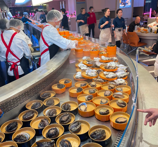 相较于原本的火锅业务,大排档店又新增了鲍鱼、生蚝等海鲜品类,部分门店设置了鲜切区、处理区,在顾客眼前杀虾片鱼。