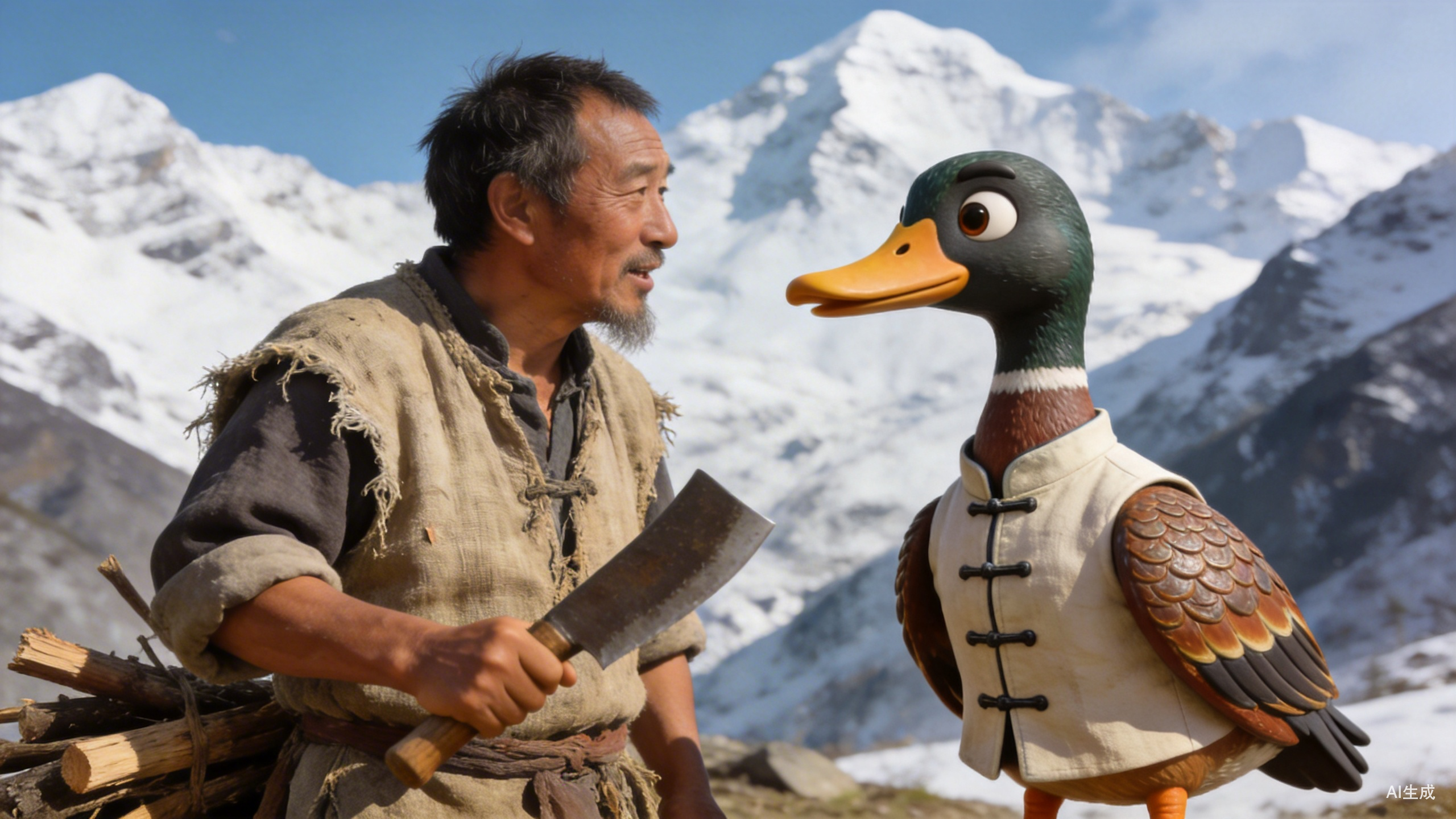 60年代邵氏武侠的画风,在皑皑白雪的深山老林里,一位樵夫(还是侠客?看不懂)为救下一只饿的奄奄一息的白狐,给它留下了一只酱板鸭,帮它熬过饥饿的冬天。