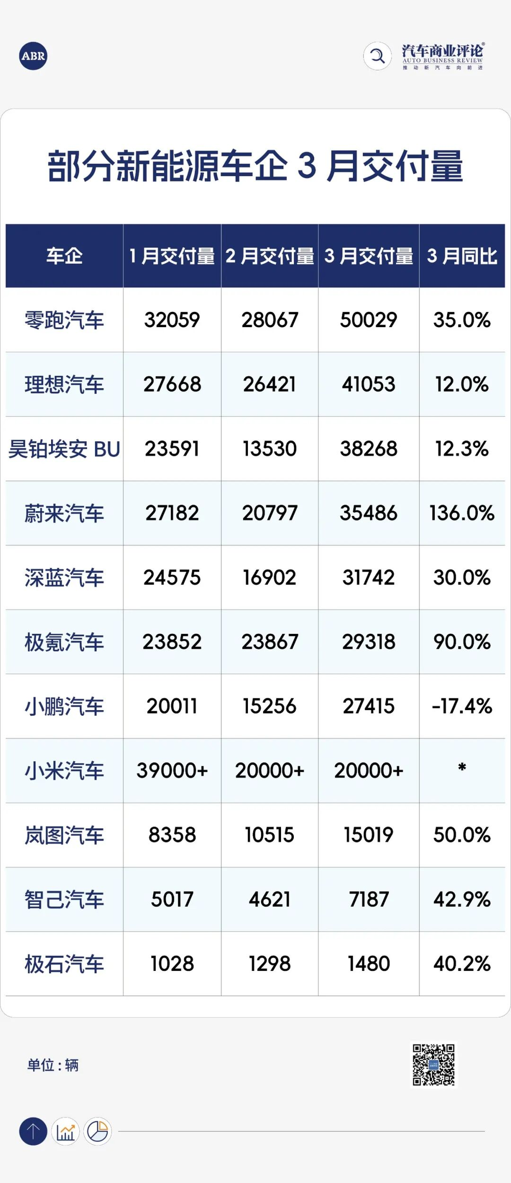 月度销量超3万辆的新势力已达5家,分别是零跑、理想、昊铂埃安BU、蔚来和深蓝。其中,蔚来超3万辆,理想超4万辆,零跑超5万辆。