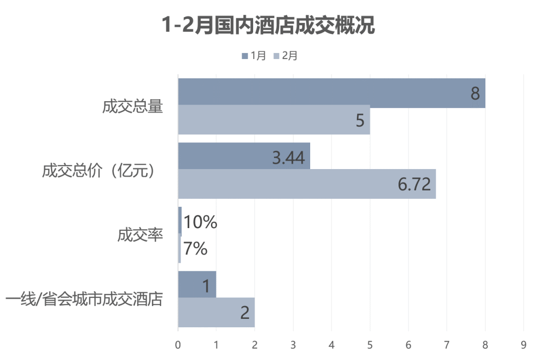 其中,1月拍卖酒店中,3亿元以下的酒店共有70家,8家成交酒店均为拍卖价亿元以下的酒店,成交酒店中仅一家为高线或省会城市酒店;2月拍卖酒店中,3亿元以下的酒店共有68家,5家成交酒店中仅有一家位于省会城市(湖北武汉)。
