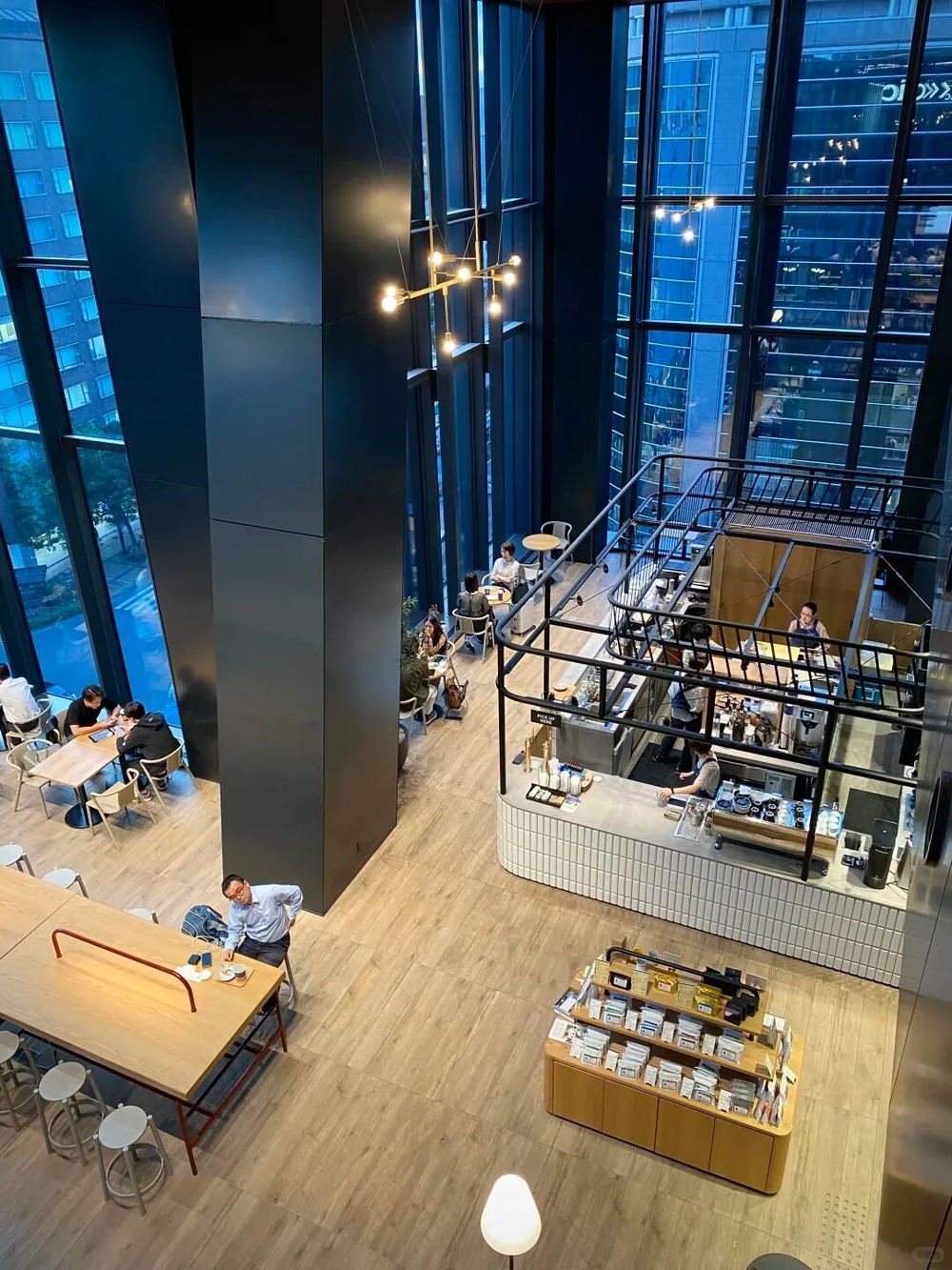 京都BAL百货顶楼的咖啡厅,做了半透的玻璃天花板,造出一个可以休息的阳光房;高轮NEWoMan楼上的咖啡厅LOOPS,在封闭空间里也做出双层挑高,中央天花板的灯光模拟自然光效果,随昼夜而变化,给人“置身室外”的错觉。