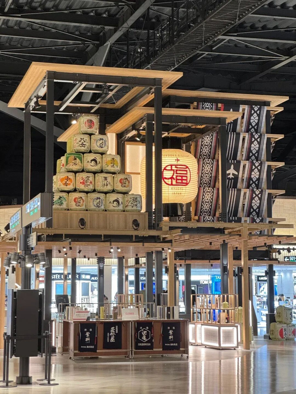 福冈ONE FUKUOKA,每层扶梯旁的巨幅本土艺术家壁画,用海洋生物、动植物描绘九州港口城市的底色,表达“当代福冈审美”;福冈机场的国际航站楼,一整片区域都更新成了博多文化街区,中央的艺术装置复刻了传统祇园祭的“橹”,用杉木做框架、挂上博多织暖帘,消解了交通枢纽的冰冷感,简单又高级。